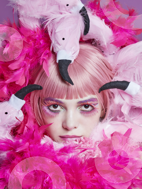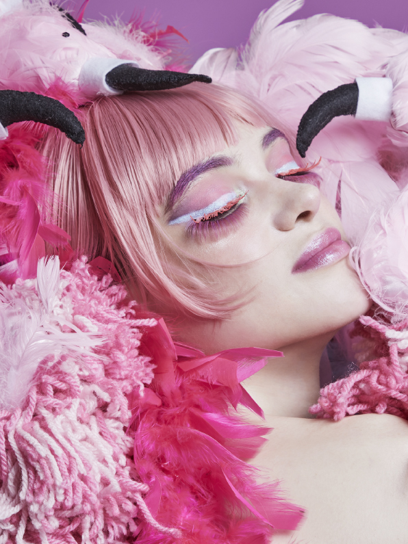 頭の部分が派手でボリュームがあるので、メイクのほうは柄やビーズを使うよりは色や線で表現したいなと思い、1カット目はピンクを目元に強く出して、まつ毛を上下につけることで羽のようなものを表現しました。